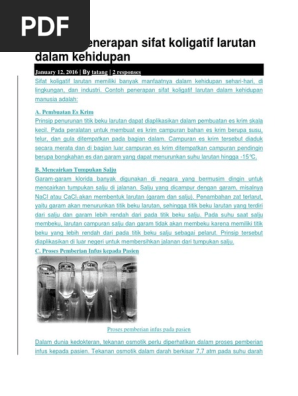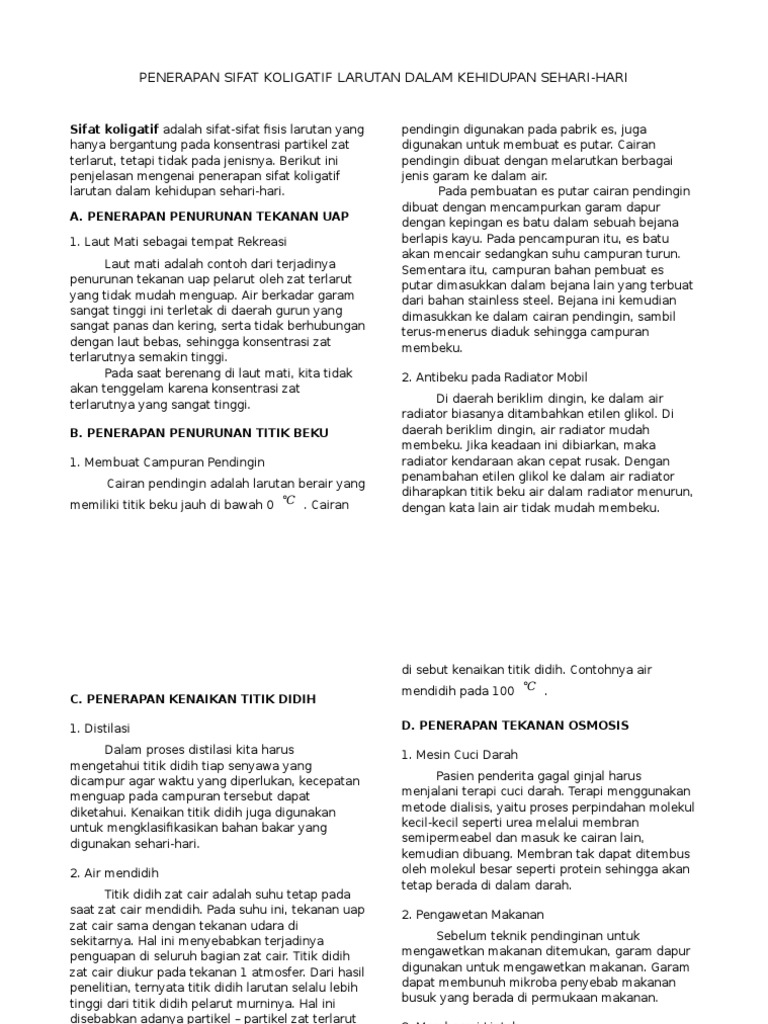 Cara kerja mesin cuci darah memanfaatkan sifat koligatif yaitu. Pada hemodialisis darah dikeluarkan dari tubuh penderita dan diedarkan dalam sebuah mesin di luar tubuh sehingga cara ini memerlukan jalan keluar masuk aliran darah. Prinsip kerja dari mesin ini yaitu darah dari tubuh akan dimasukkan ke dalam mesin dan akan melalui suatu membran semipermeabel. Penerapan sifat koligatif larutan dalam kehidupan sehari hari sifat koligatif adalah sifat sifat fisis larutan yang hanya bergantung pada konsentrasi partikel zat terlarut tetapi tidak pada jenisnya. Pompa darah berfungsi untuk mengalirkan darah dari tempat tusukan vaskuler ke alat dializer.
