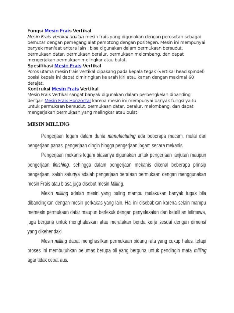 Fungsi mesin milling universal. Meja ini mempunyai fungsi utama untuk mengikat benda selama proses pengefraisan. Mesin milling copy merupakan mesin milling yang digunakan untuk mengerjakan bentukan yang rumit. Bagian ini terdiri dari spindle motor penggerak dan mekanisme pengendali lainnya. Mesin milling universal berdasarkan fungsi penggunaannya antara lain.