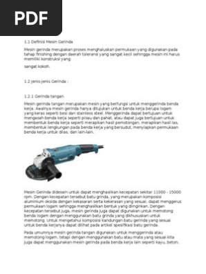 Mesin gerinda didesain untuk dapat menghasilkan kecepatan sekitar 11000 15000 rpm. Dengan kecepatan tersebut juga mesin gerinda juga dapat digunakan untuk memotong benda logam dengan. Mesin gerinda didesain untuk dapat menghasilkan kecepatan sekitar 11 000 15 000 rpm. Dengan kecepatan tersebut juga mesin gerinda juga dapat digunakan untuk memotong benda logam dengan.