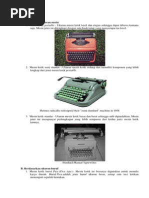 Mesin tik terdiri dari beberapa jenis yang bisa dikategorikan berdasarkan ukuran huruf dan tenaga penggeraknya berikut masing masing penjelasannya. 2 gandaran pada mesin ketik ini dapat digeser secara manual ke arah kanan maupun ke kiri. Mesin ketik manual memiliki ciri ciri sebagai berikut. Mesin ketik standar ukuran mesin ketik besar dan berat sehingga sulit dipindahkan.